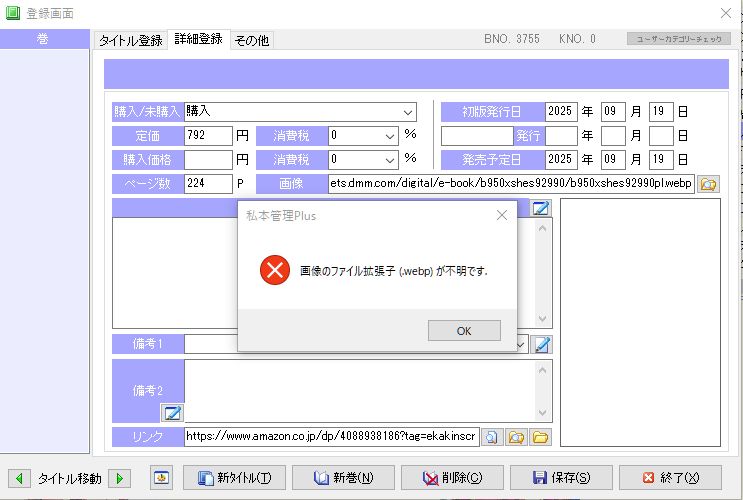 詳細画面を開く際に「画像のファイル拡張子(.webp)が不明です」とポップアップが出る状況です。