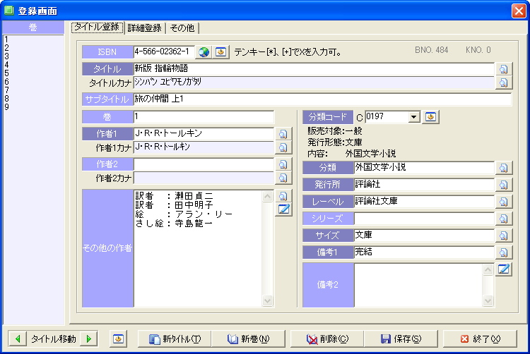 - タイトル、作者、発行所、発行日、メモなどの基本情報を登録